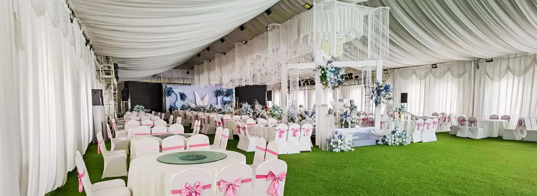 盛億欣婚慶篷房采用單元組合式設計,長度可按5米間距增加或減少,可根據婚禮宴會規模量身定制,篷布頂可以是純白色的,可以是紅色的,還可以是透明的,歐式的、田園風、中式等各種主題都可以在婚慶篷房里得以展現。